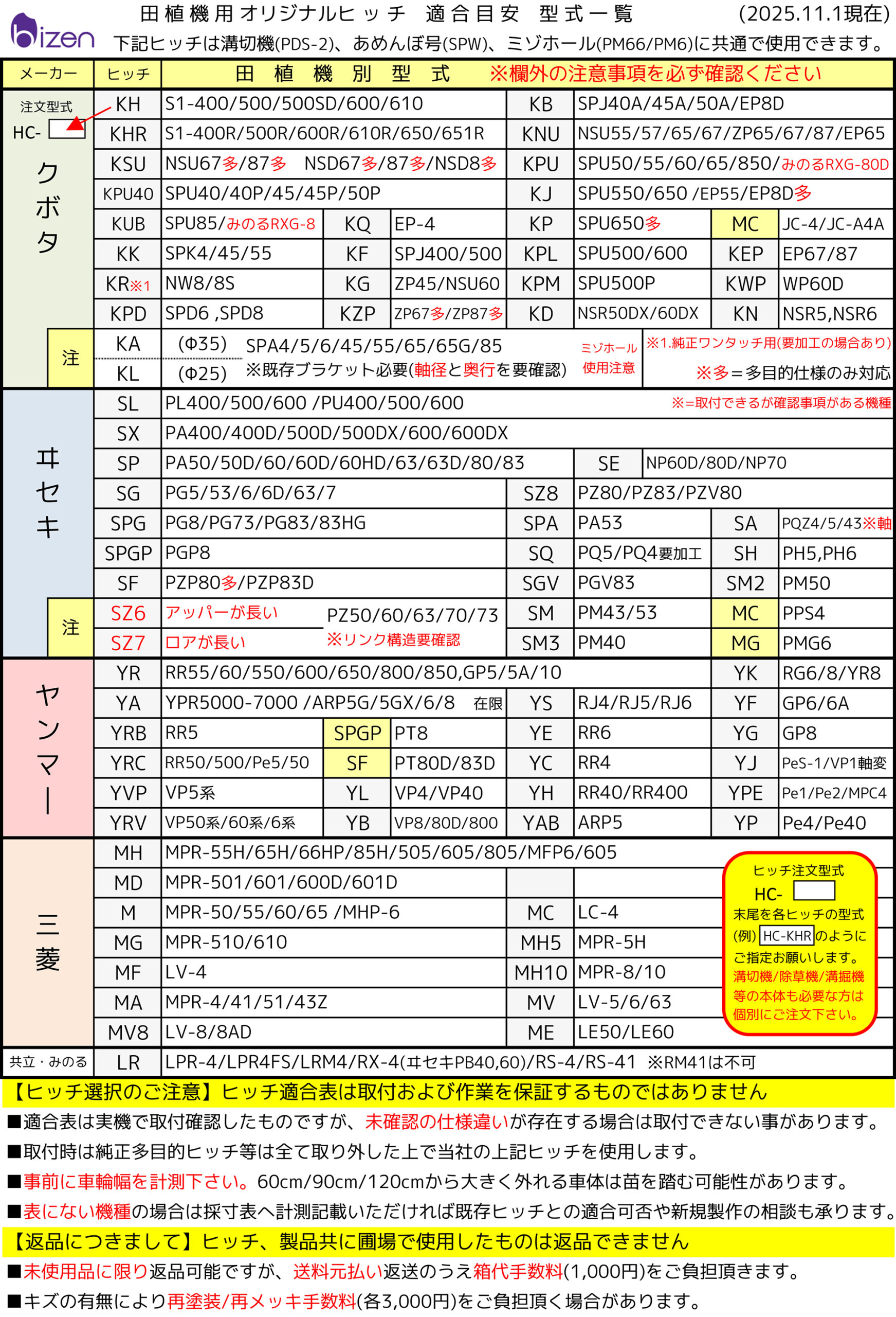 ヒッチ適合表は表示の機種に必ず取付できると保証するものではありません。弊社で実機を計測した田植機の型式を掲載しておりますが、田植機には同じ型式であっても仕様の違いによりヒッチを取り付けする部分の構造が全く違う場合があります。そのため適合表にある機種用のヒッチをお使い頂いても、ボルト径などが合わない、穴位置が違うなどの理由で取付できない事が希にあります。