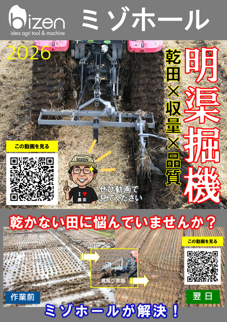 【水田用溝掘機ミゾホールは、乾田、土質改善、防除が一度に期待できます】