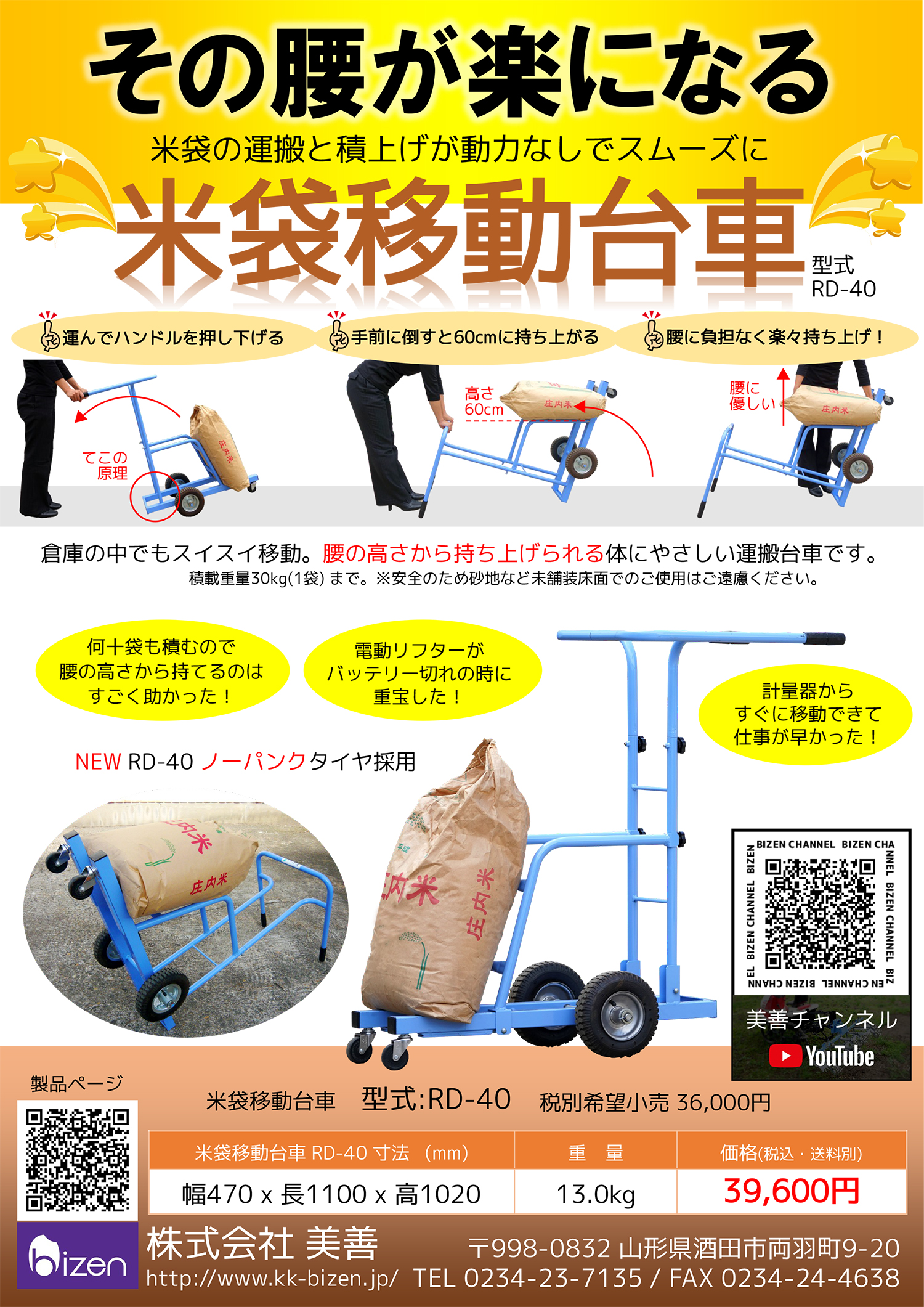 初期型を2004年に発売以来20年超のロングセラー。農機有名ディーラー各社様を始め、多くの農機販売店様から取扱い頂き、全国の農家さまにご支持を頂いております。お米の出荷に1台あると重宝します。電動リフトなど便利な機械もあるけれど、急なバッテリー切れで困った時、ちょっと運びたい時にサッと出せる軽さが最高。動力なしで狭い通路や倉庫の中もスイスイ歩ける。気づいてみたら一番使ってるかも知れません。引き倒せば腰の位置から持ち上げられるので、繰り返しの積上げ作業も楽になります。RD-40からノーパンクタイヤを採用しています。